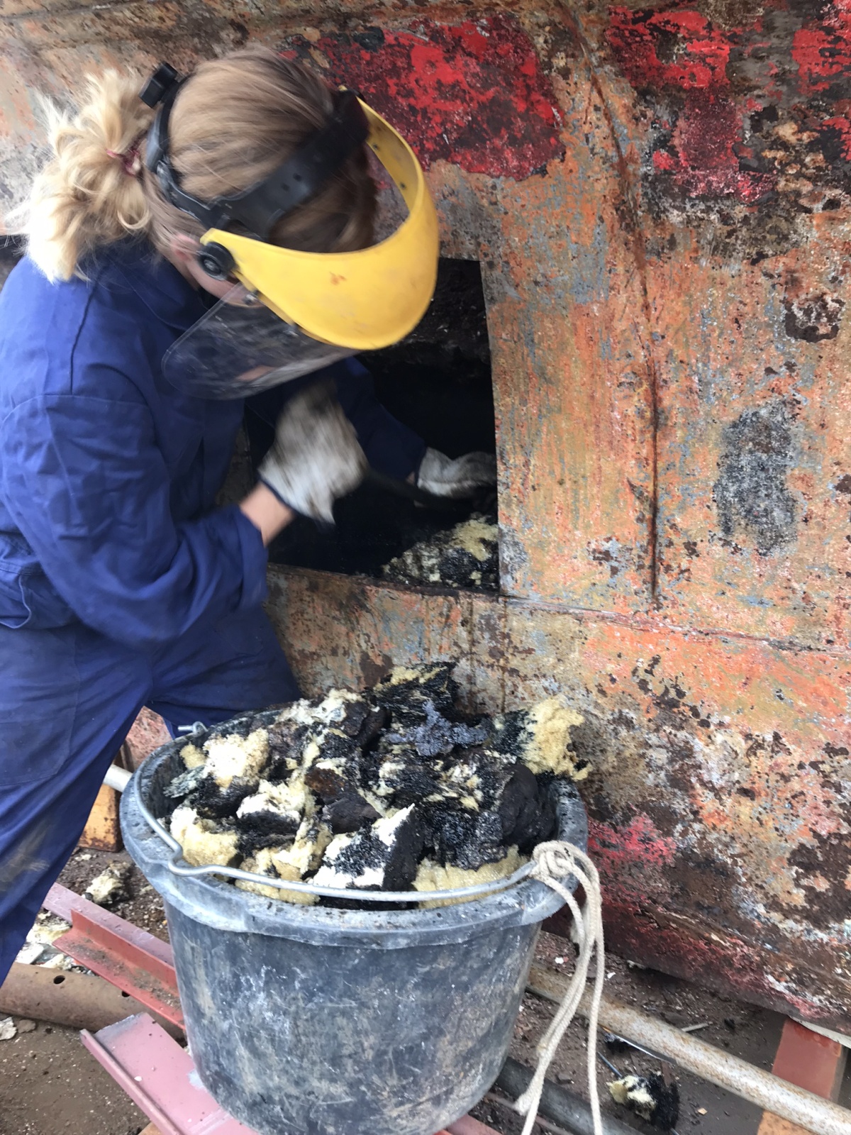 Dit jaar proberen we zo veel mogelijk te klussen in de weekenden aan EMMA. Sinds de vorige update over de boeg zijn we nu aan de achterkant bezig. In het achterste stukje van de kiel zat een combinatie van teer, pur en beton gegoten. Dit heeft het vocht helaas niet tegen gehouden, de pur functioneerde als een soort spons waarbij de binnenzijde van de huid op lokale plekken extra hard aan het wegrotten was. Putcorrosie wordt dit genoemd. Waarschijnlijk is in het achterste deel van de kiel pur gebruikt omdat EMMA wat zwaar in de kont was. Toen we het beton weg bikten in de boeg, was duidelijk te zien dat hier later extra beton bij gegoten was om de boot recht op de waterlijn te leggen. Dit alles zal vermoedelijk komen door de zeer zware Yanmar 3QM30, de motor, die in de boot lag. Gecombineerd met de brandstoftank van 200 liter die daar achter stond.