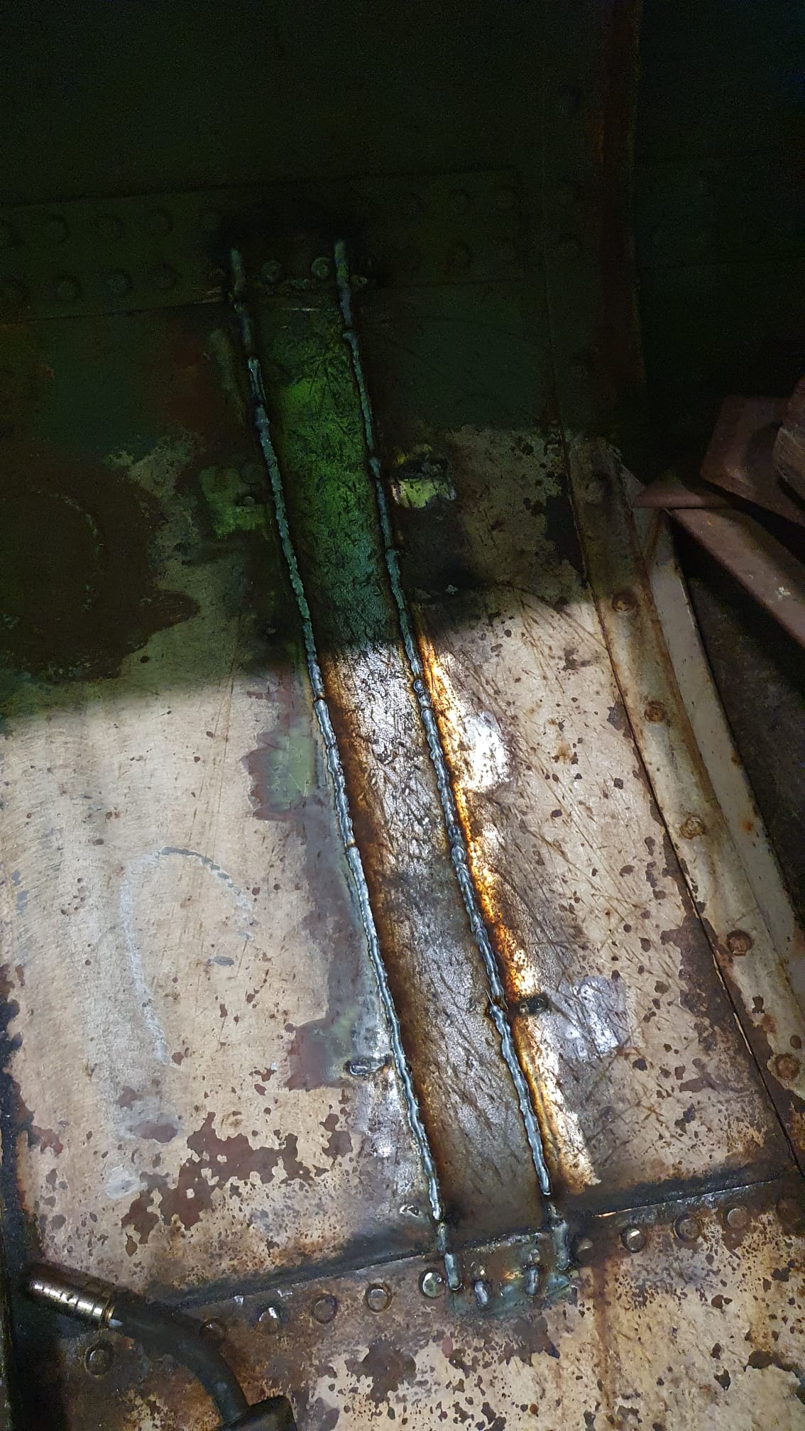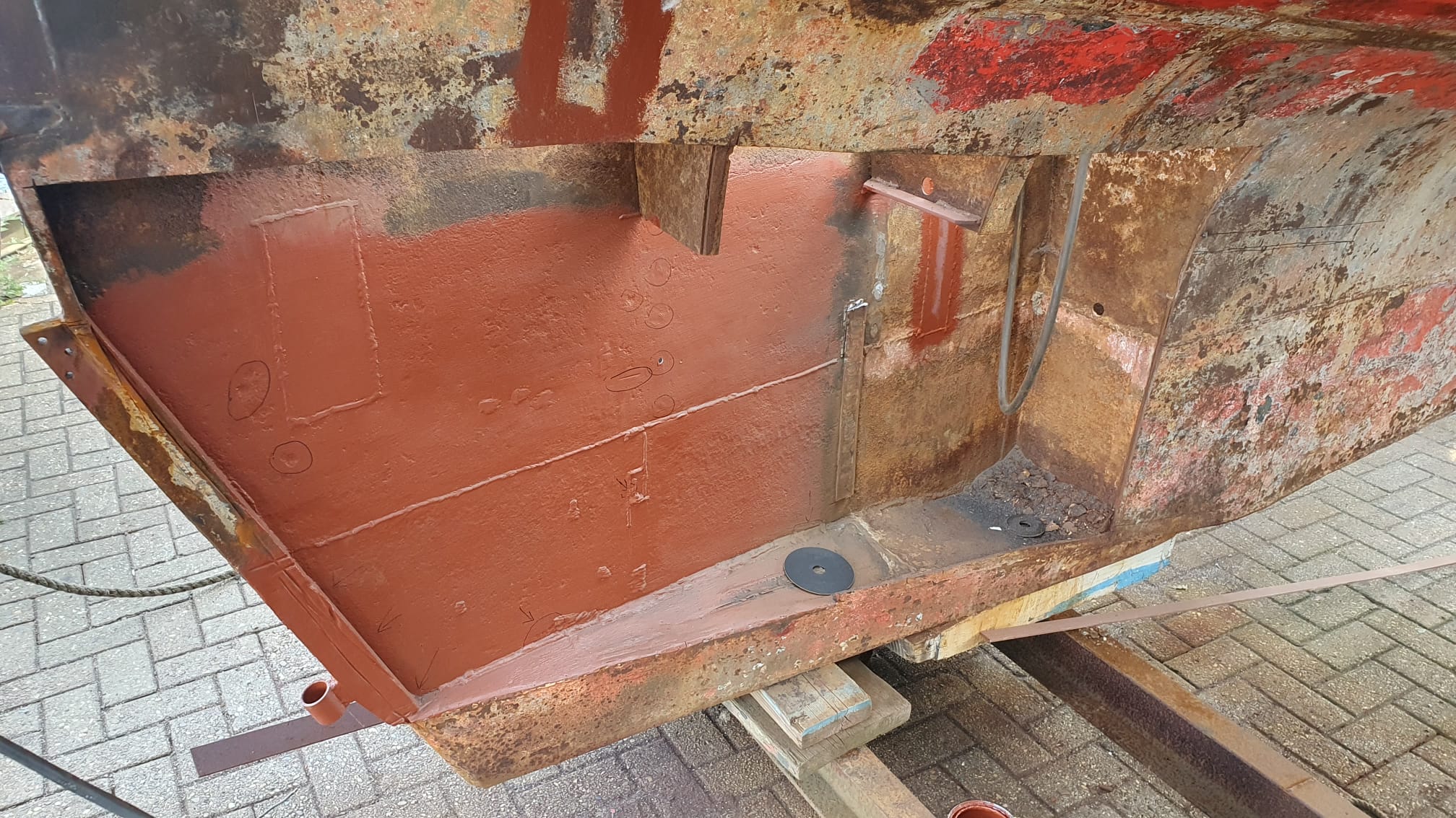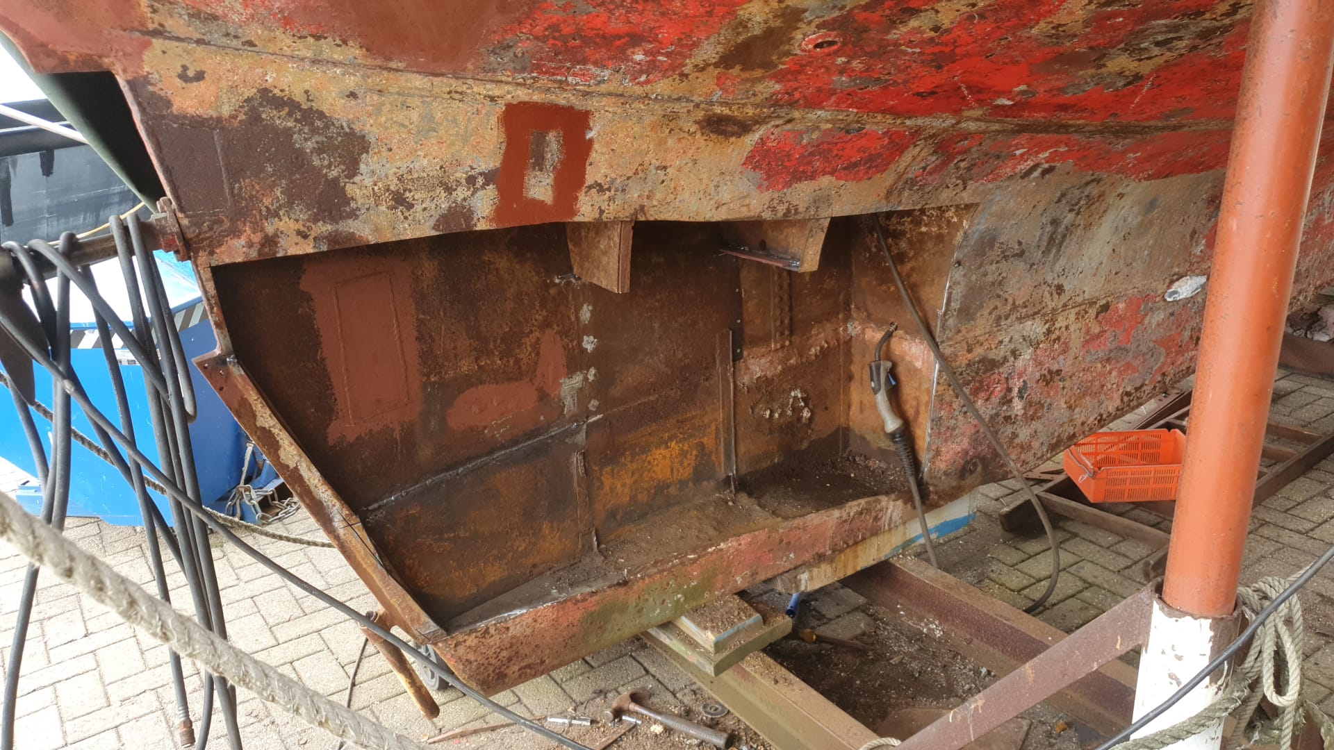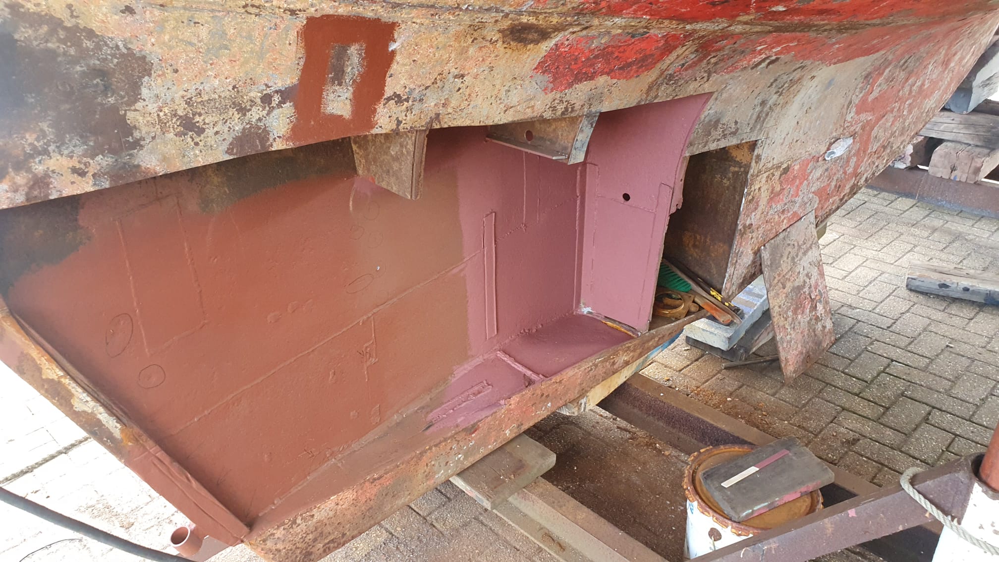 Het verwijderen van de huid aan Stuurboordzijde is een absolute rotklus, het lukt niet om de plaat als een geheel te verwijderen door de spanten, dus stukje bij beetje en talloze slijpschijven verder hebben we het grootste deel eruit en zijn de eerste lasnaden opnieuw gelegd. Binnenkort maken we een nieuwe tanktop waar tussen de spanten inspectiedeksels in zullen komen. Vervolgens zetten we nieuwe spantdelen in de tank en bovenop de tank. De huid zal als sluitplaat als laatste er tegenaan gezet worden. Op dit moment hebben we bijna alle roest verwijderd en voor nu een laag menie op het staal gezet.